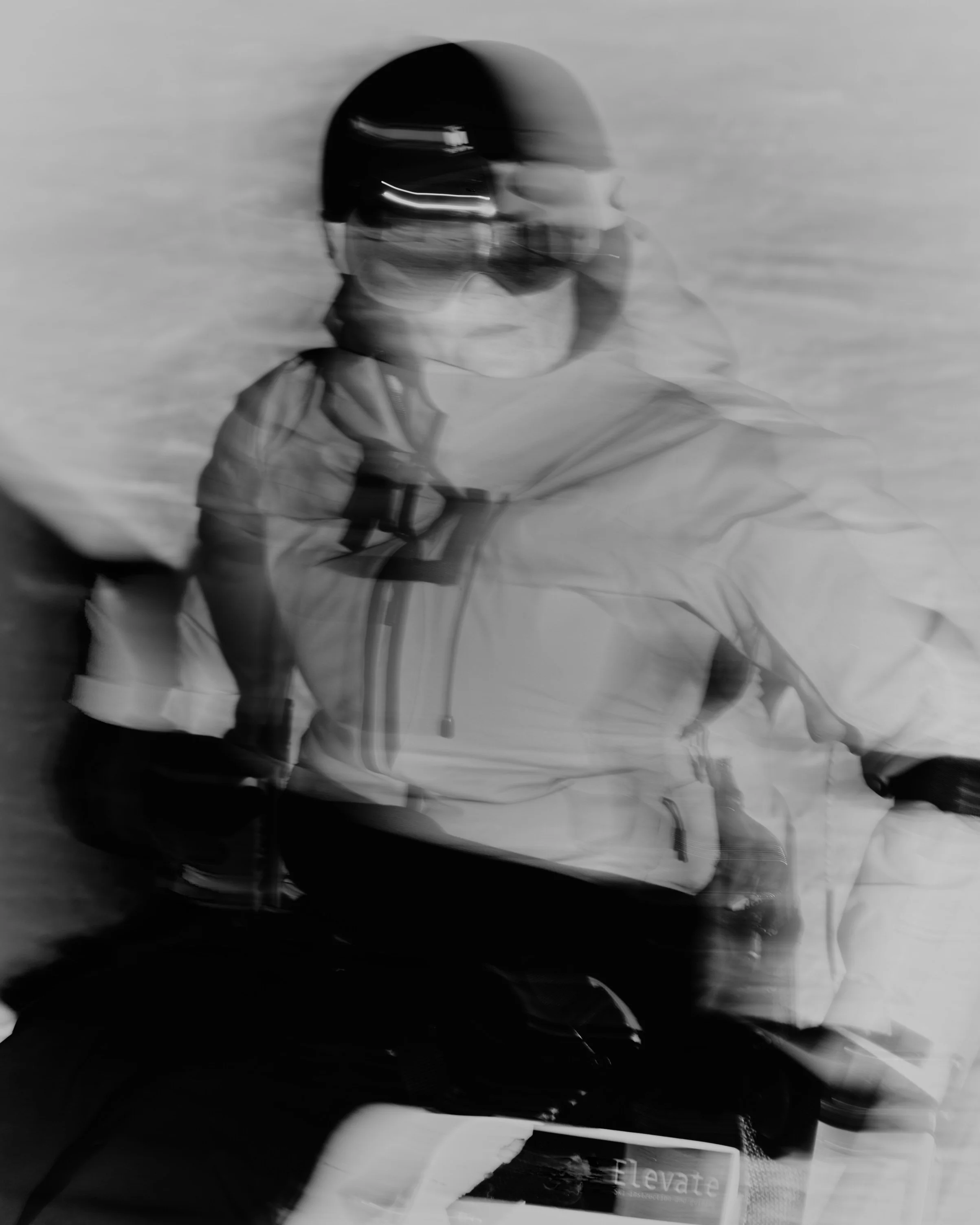 An adaptive skier on a snowy slope, with blurred skiers in the background.